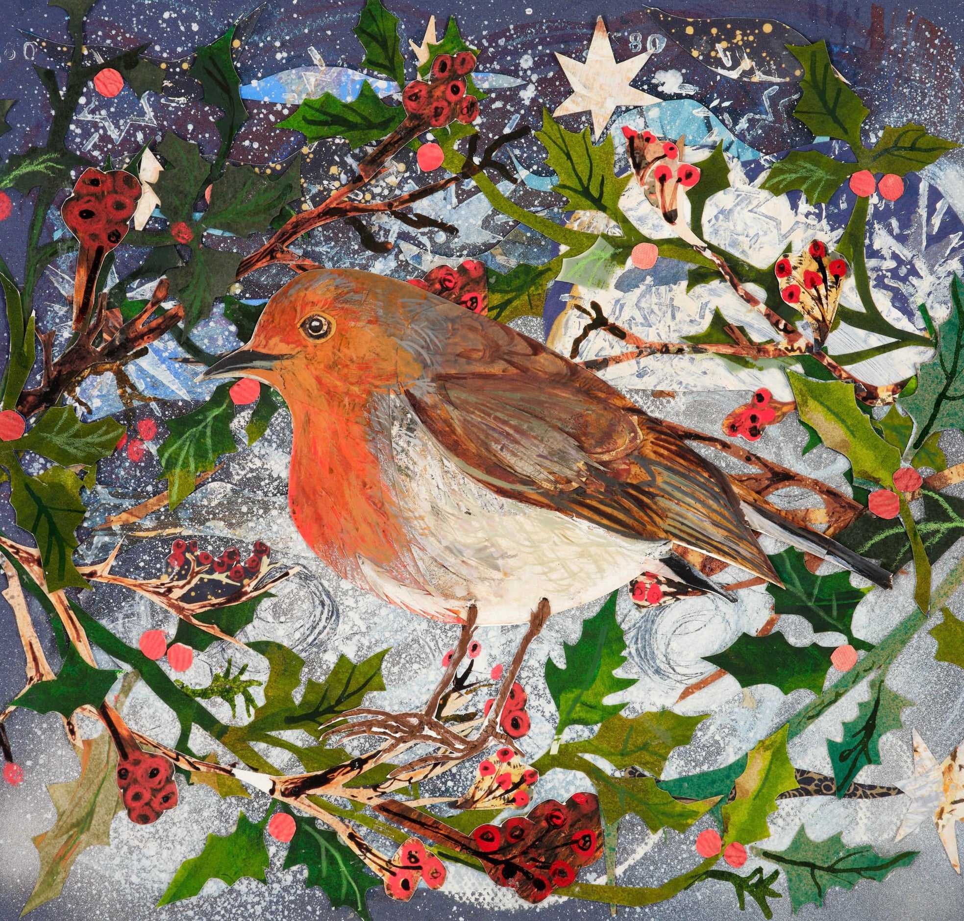 “Festive Robin” was a mixed media painting on card using a rich combination of collage, acrylic paint, inks and pastel.